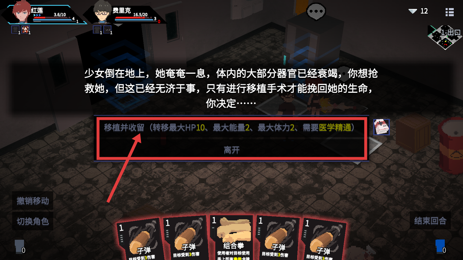 2、选择【移植并收留】,转移最大HP10、最大能量2、最大体力2(需医学精通),提升角色属性。