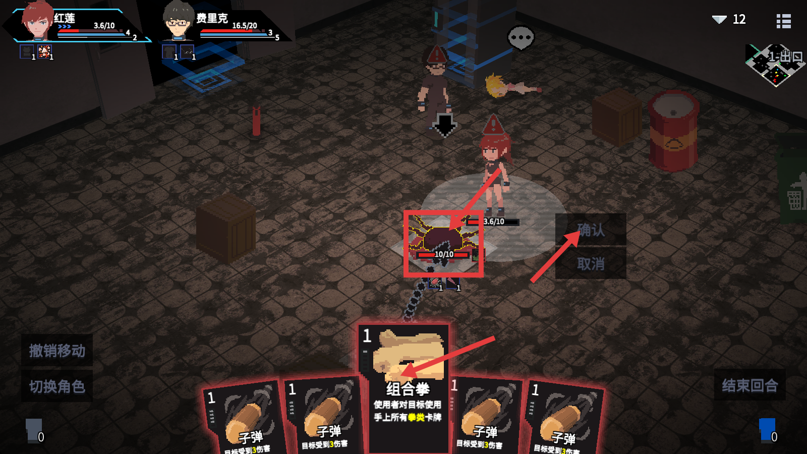 3、战斗时使用【组合拳】卡牌,瞄准敌人发起攻击,点击【确认】,高效完成战斗。