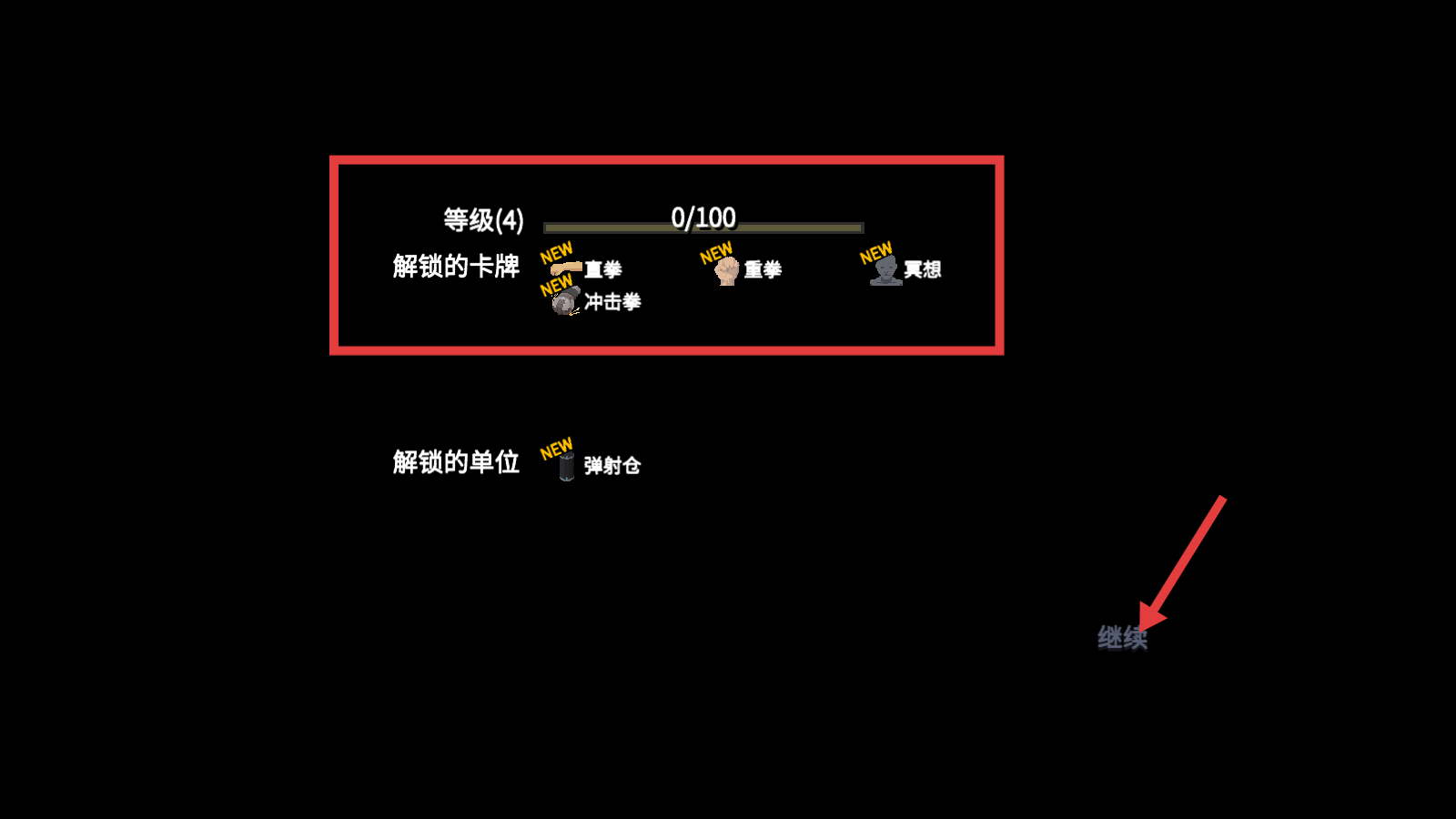 4、等级提升至4级,解锁【直拳】【重拳】等卡牌与弹射仓单位,点击【继续】,推进游戏进度。