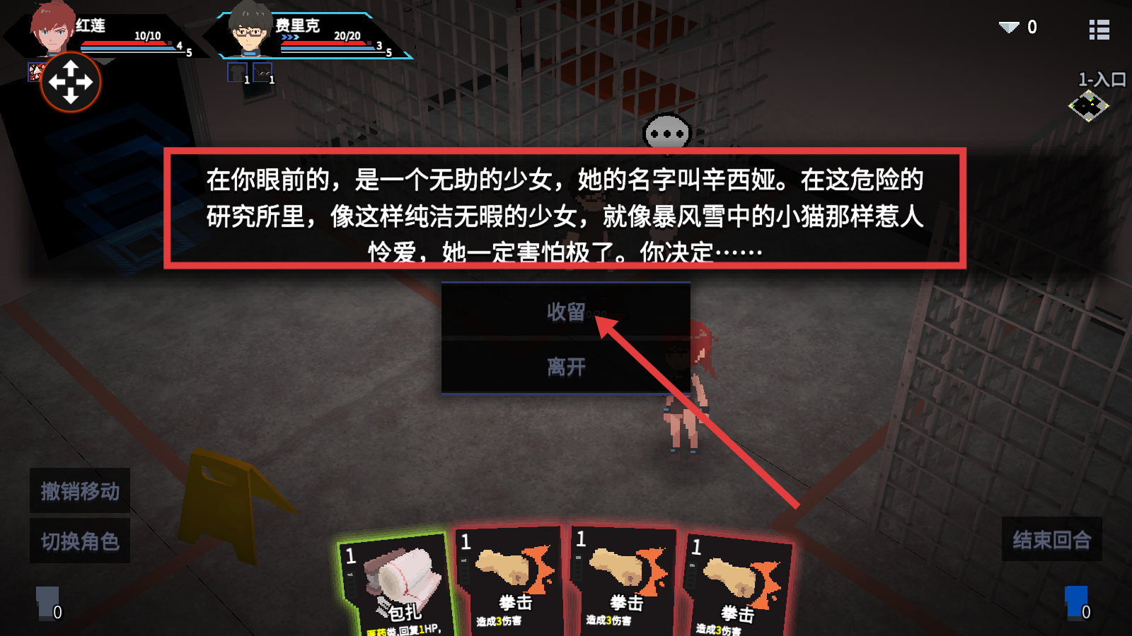 3、遇到无助少女辛西娅,选择【收留】,解锁新队友,丰富队伍配置。
