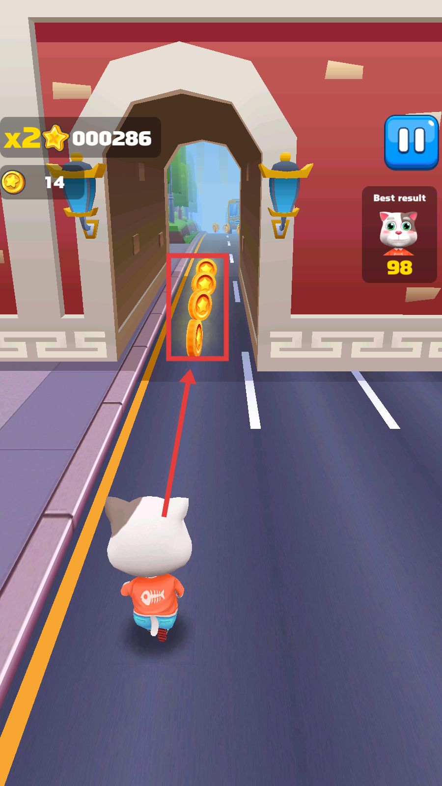 2、跑酷时优先收集红色框选的金币,积累资源,提升游戏分数。