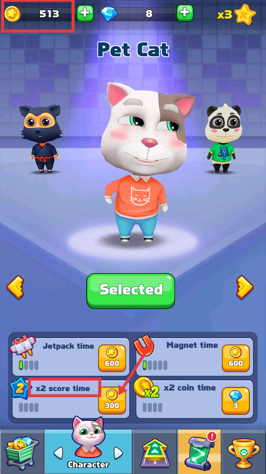 1、在角色界面,花费300金币升级【x2-score-time】,提升得分效率,利用现有513金币优化角色能力。