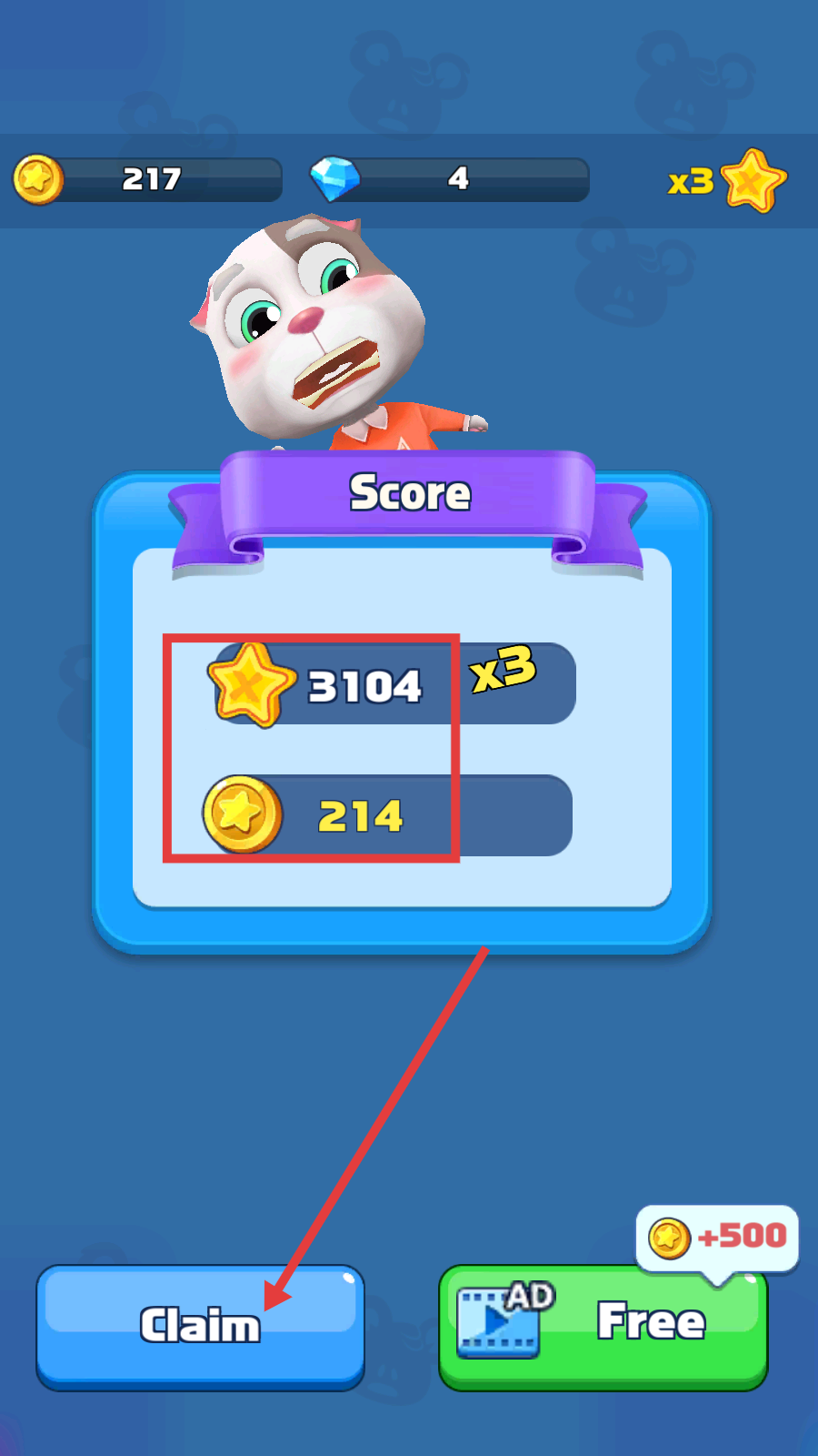 4、游戏结束后查看【3104】分数与【214】金币,点击【Claim】领取奖励,继续挑战新纪录。