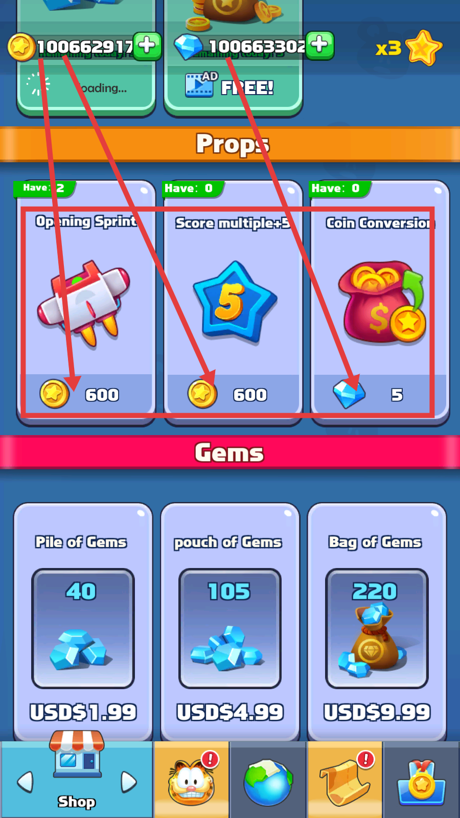 1、在商店购买【Opening-Sprint】【Score-multiple+5】等道具,花费金币或钻石,提升跑酷能力,助力高分挑战。