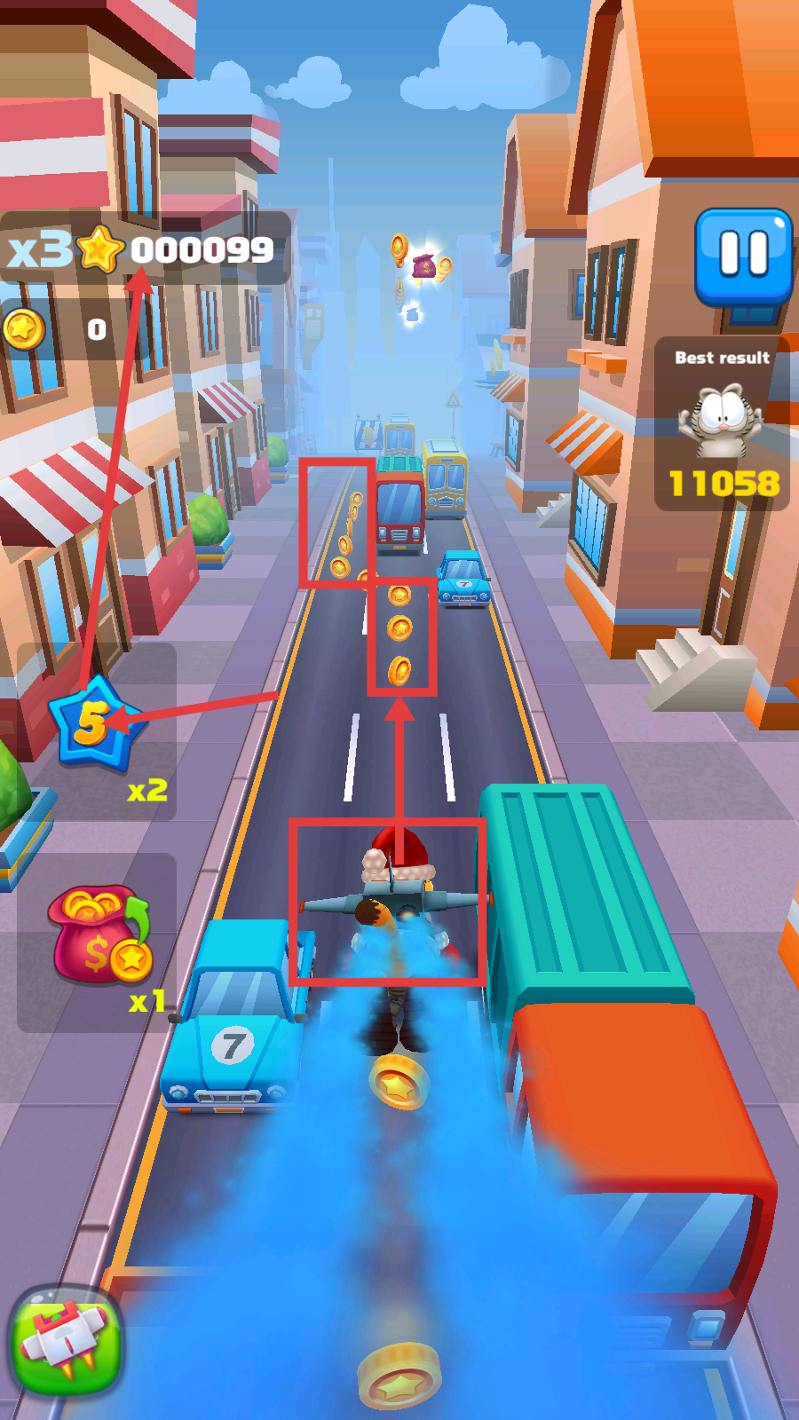 3、跑酷时收集金币,利用【x5】星星道具提升分数,操控角色躲避车辆,积累高分,推进游戏进程。