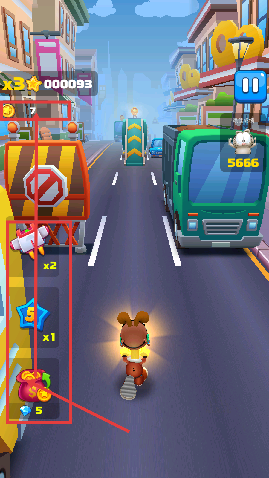 2、跑酷时收集金币,同时获取火箭、星星、金币袋等道具,提升跑酷效率与资源积累。
