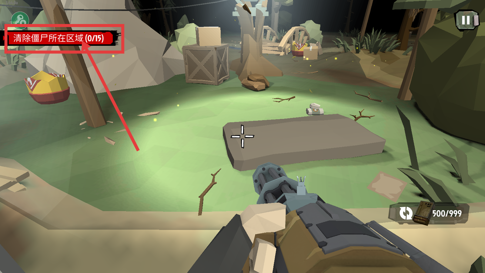 1、明确任务目标为“清除僵尸所在区域(0/15)”,进入游戏场景,准备开展僵尸清除战斗。