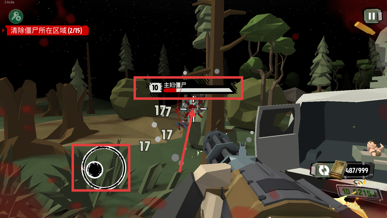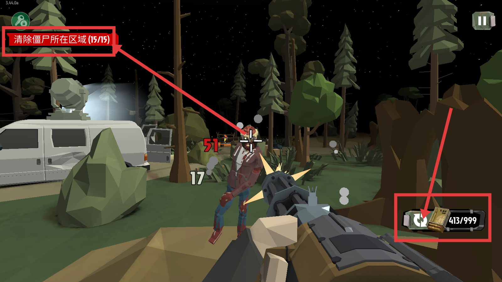 3、战斗时留意弹药数量(如413/999),确保弹药充足,顺利完成15个僵尸区域的清除任务(15/15)。