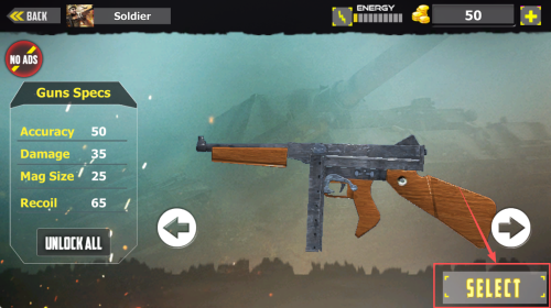 3、如何查看武器属性:在武器选择界面,点击“SELECT”按钮,查看枪支的具体属性。