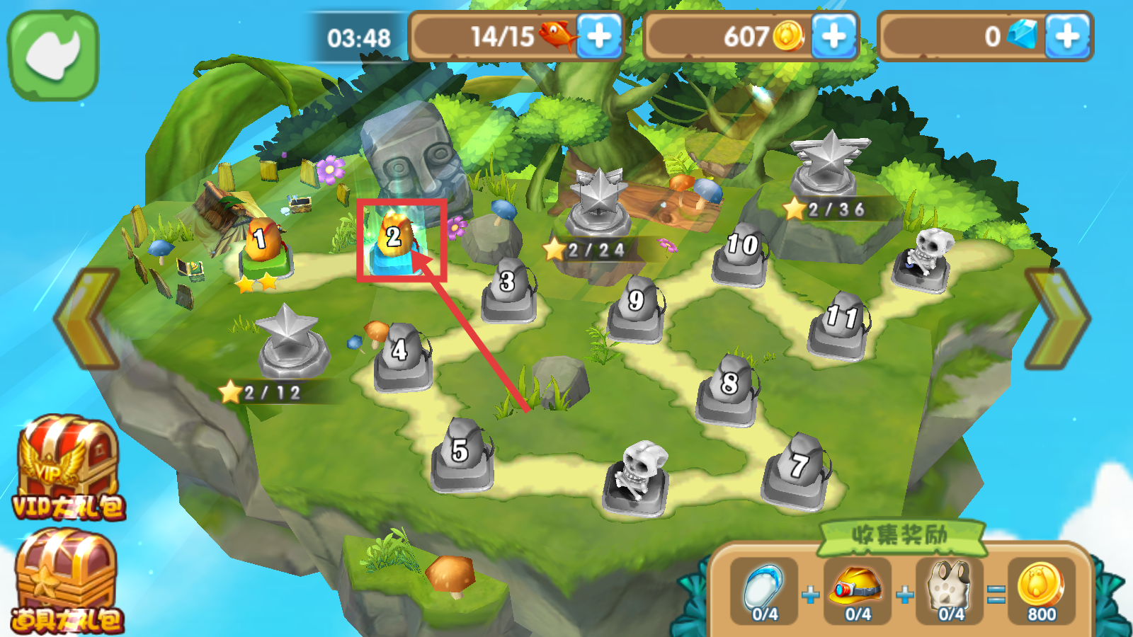 1、选择关卡时优先挑战如【2-关】的可解锁关卡,留意上方【鱼-14/15】【金币-607】等资源,规划闯关顺序以逐步解锁更多关卡。