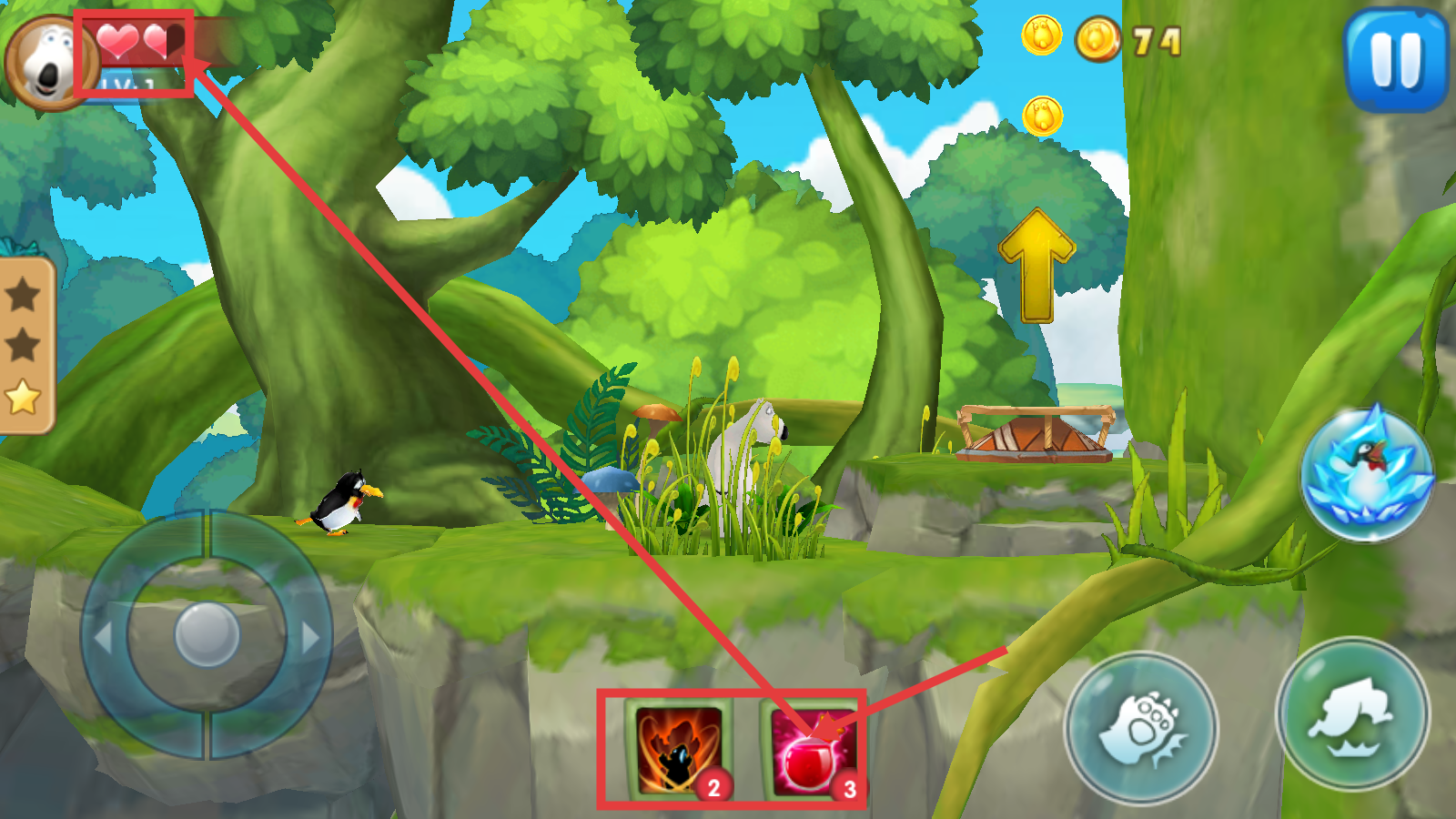 3、注意左上角【生命值】变化,当血量不足时及时使用下方技能道具,如【红色药瓶-3】等,保障角色生存能力以顺利闯关。