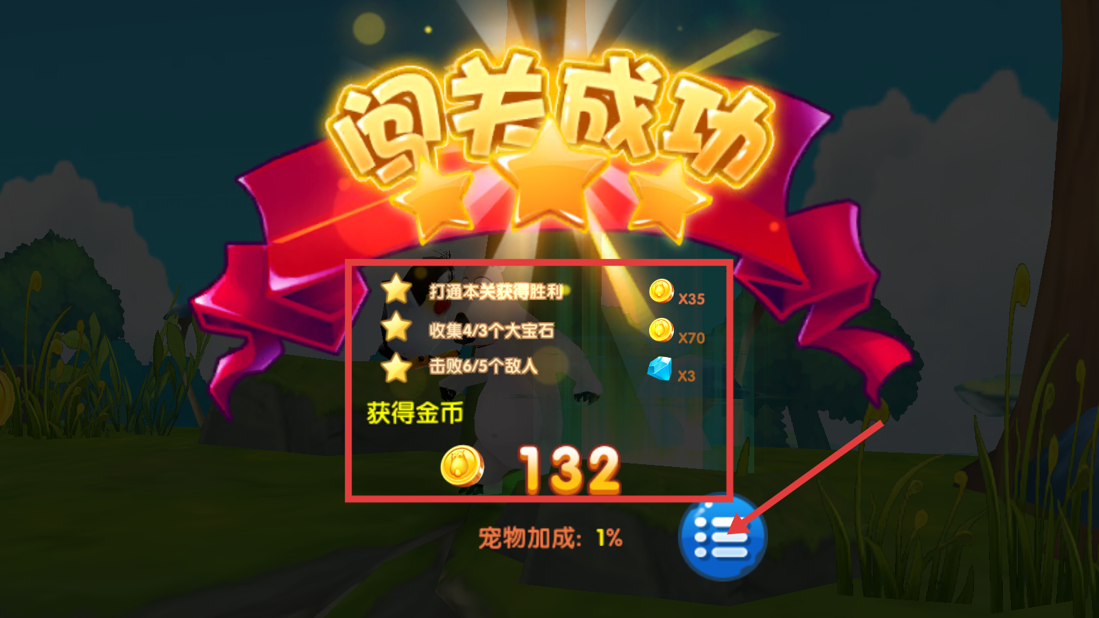 4、闯关成功后可获得【金币-x35/x70】【钻石-x3】等奖励,留意【宠物加成-1%】的收益提升,点击下方按钮查看后续关卡或奖励详情。