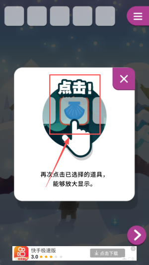 2、接着,了解如何操作道具,点击屏幕提示中的“点击”进行学习。