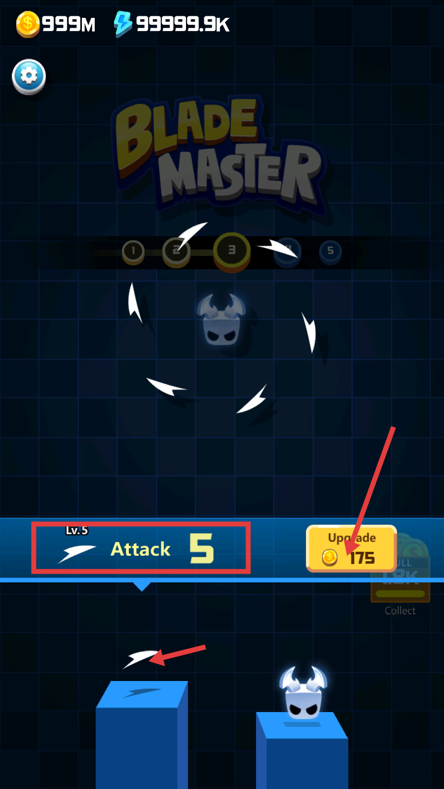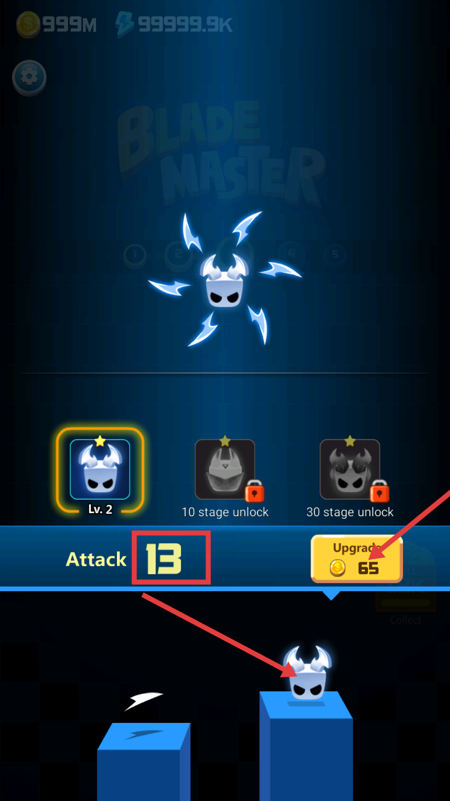 1、在【Blade-Master】中,消耗【65-金币】升级攻击至【13】,提升角色战力,为后续关卡战斗奠定基础。