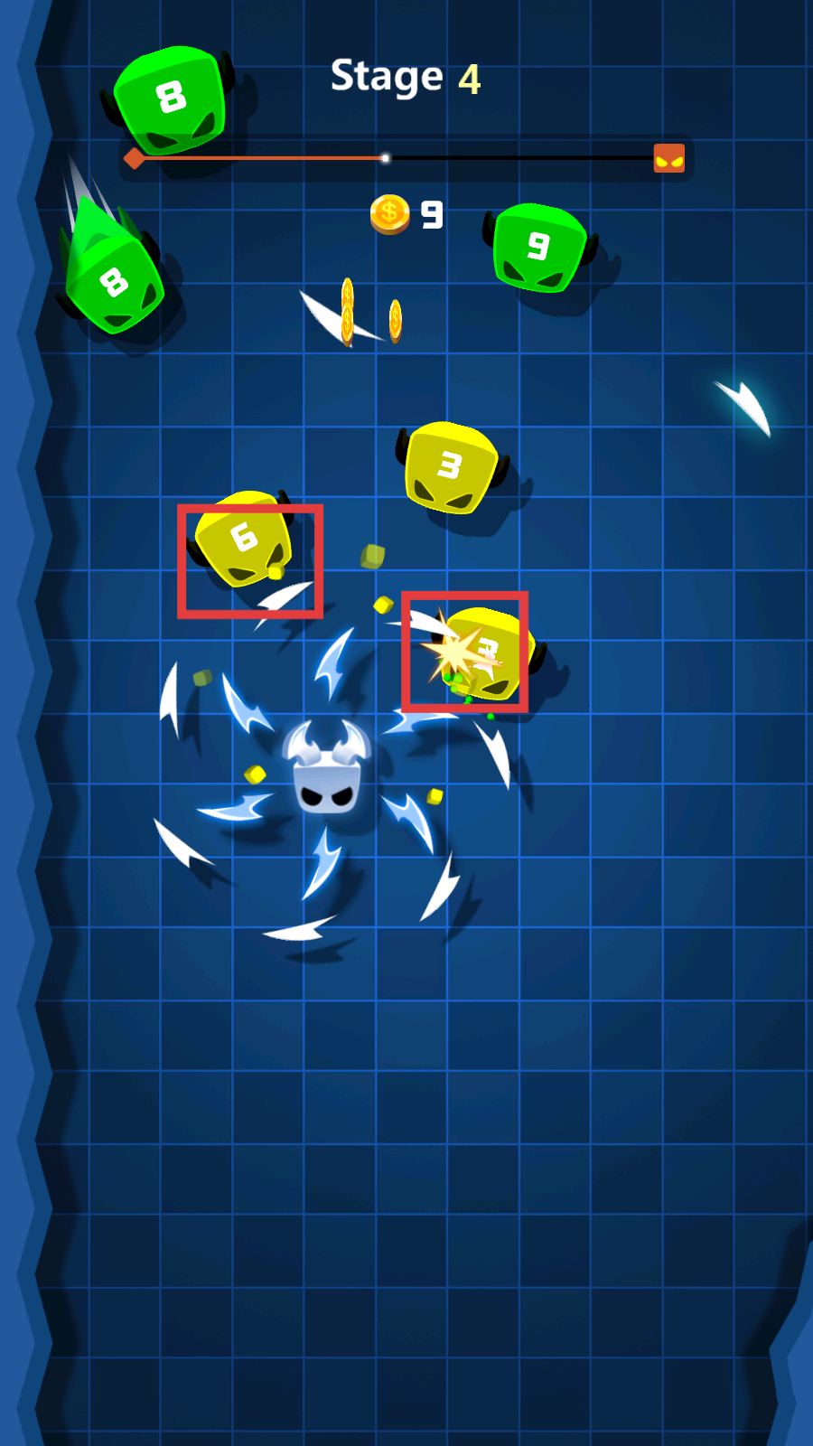 3、挑战【Stage-4】时,优先攻击数字低的敌人,如【3】【6】标识的敌人,同时收集场景中的【金币】,高效推进关卡。