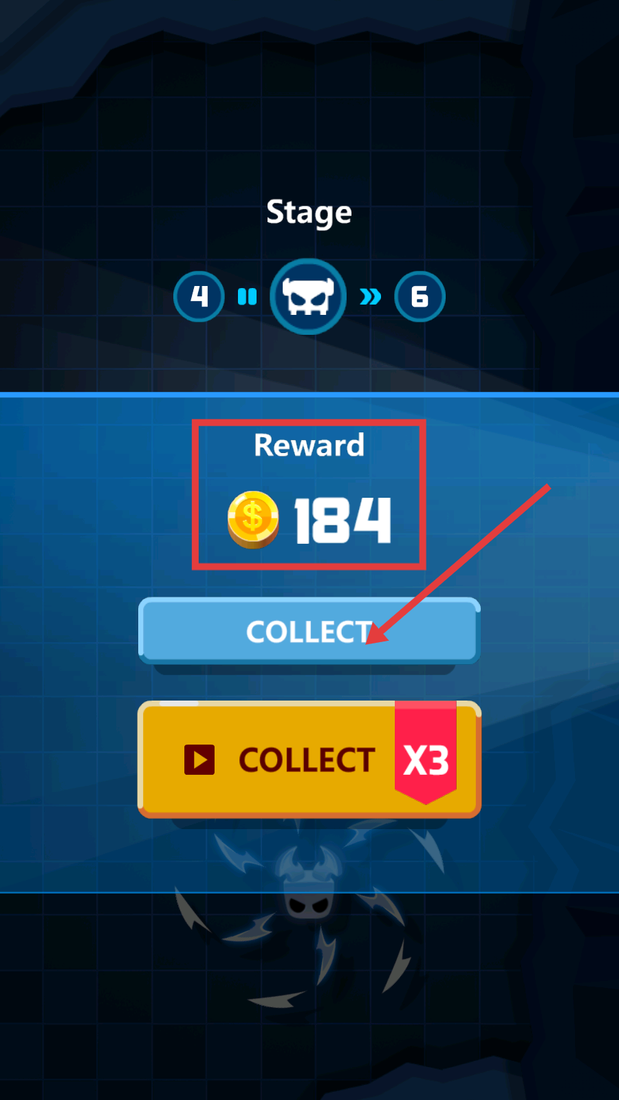 4、完成关卡后,点击【COLLECT】领取【Reward-184】金币,积累资源用于角色或技能升级,助力后续关卡挑战。