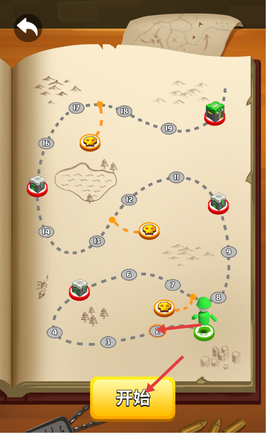 1、在关卡地图中选择【2-关】,点击下方【开始】按钮,进入关卡准备战斗,按地图路径逐步推进解锁后续关卡。