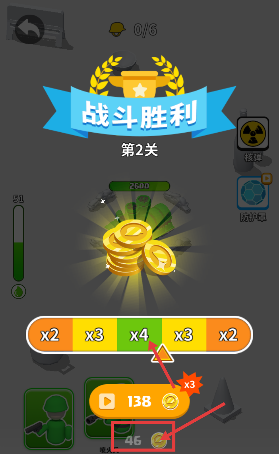 4、战斗胜利后,领取【46-金币】奖励,积累资源用于升级兵种或建筑,增强后续关卡的战斗实力。