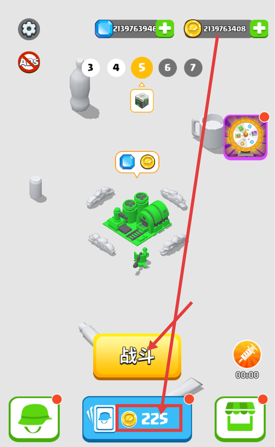 1、点击【战斗】按钮前,可消耗【金币-225】提升战力,合理利用资源为关卡战斗做好准备。