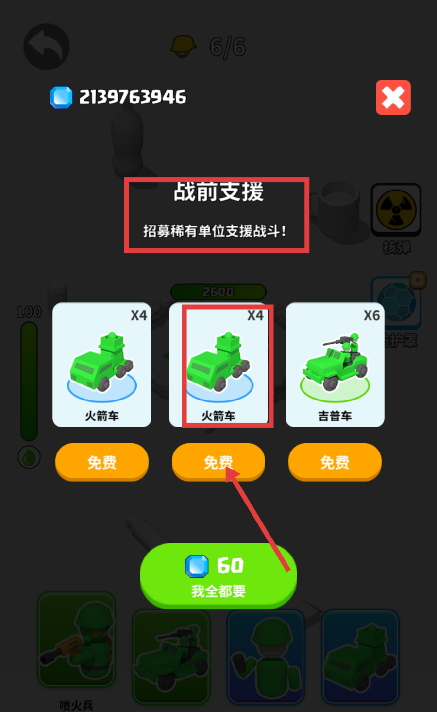 2、在【战前支援】界面,免费招募【火箭车】等稀有单位,为战斗增添强力战力,提升获胜概率。