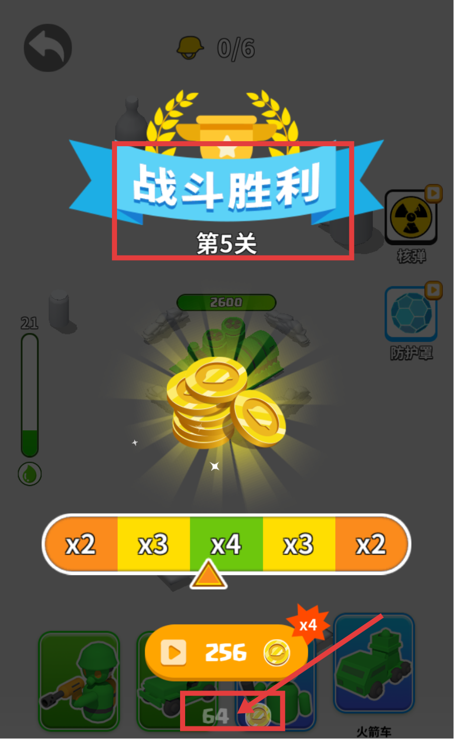 4、获得【战斗胜利-第5关】后,领取【金币-64】奖励,积累资源用于后续单位升级或资源获取。