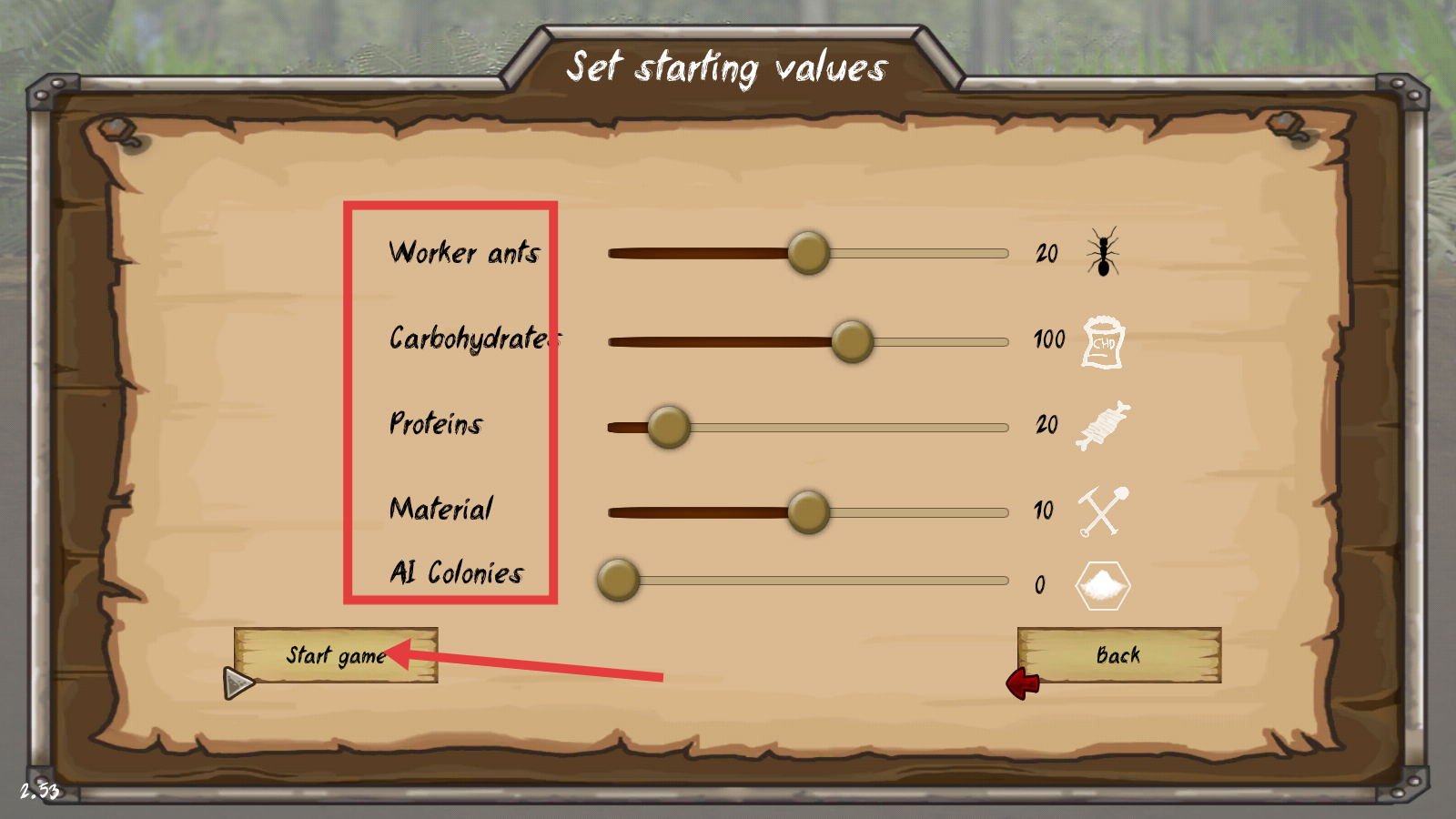 1、在初始值设置界面,调整【Worker-ants】【Carbohydrates】【Proteins】等参数后,点击【Start-game】,完成蚁群模拟的开局配置。