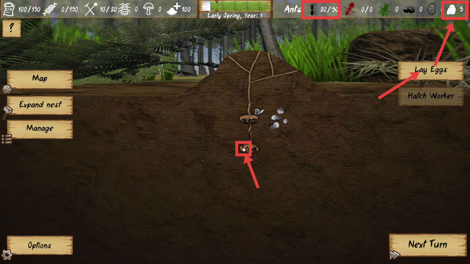 2、进入游戏后,关注【Ants-20/30】的工蚁数量,点击【Lay-Eggs】产卵,为蚁群扩张储备新成员,同时留意蚁巢核心区域的动态。
