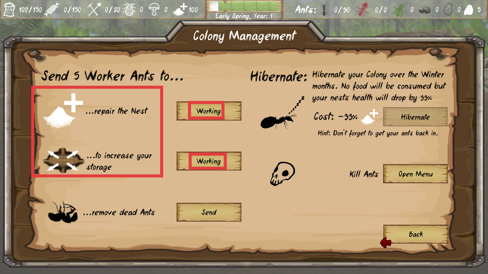 3、在【Colony-Management】界面,派遣工蚁执行【repair-the-Nest】和【increase-your-storage】任务,提升蚁巢稳定性与资源存储能力。