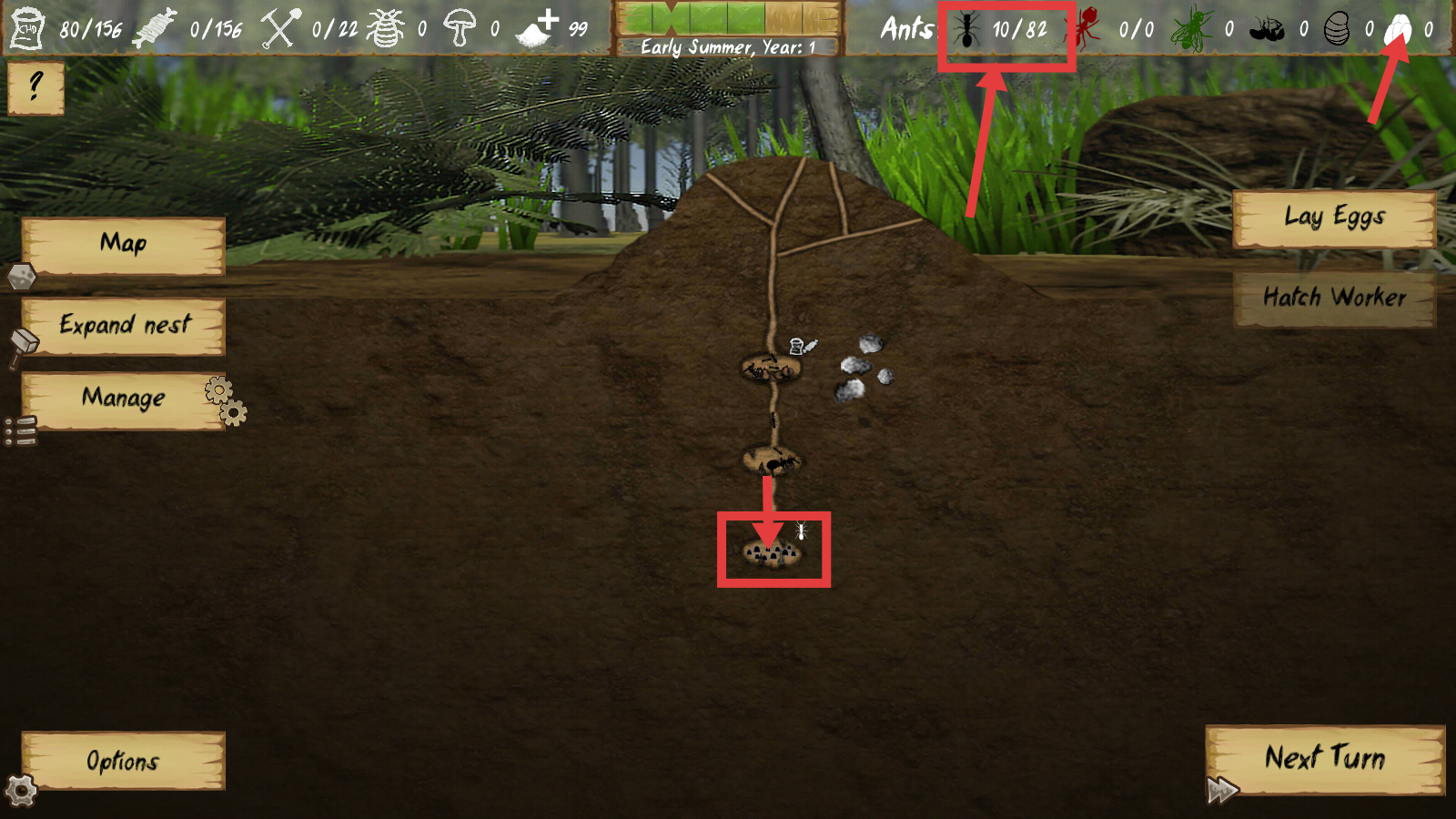 4、发展阶段,关注【Ants-10/82】的工蚁规模,观察新巢穴区域的建成,持续扩张蚁巢结构,推动蚁群数量与设施的双重发展。