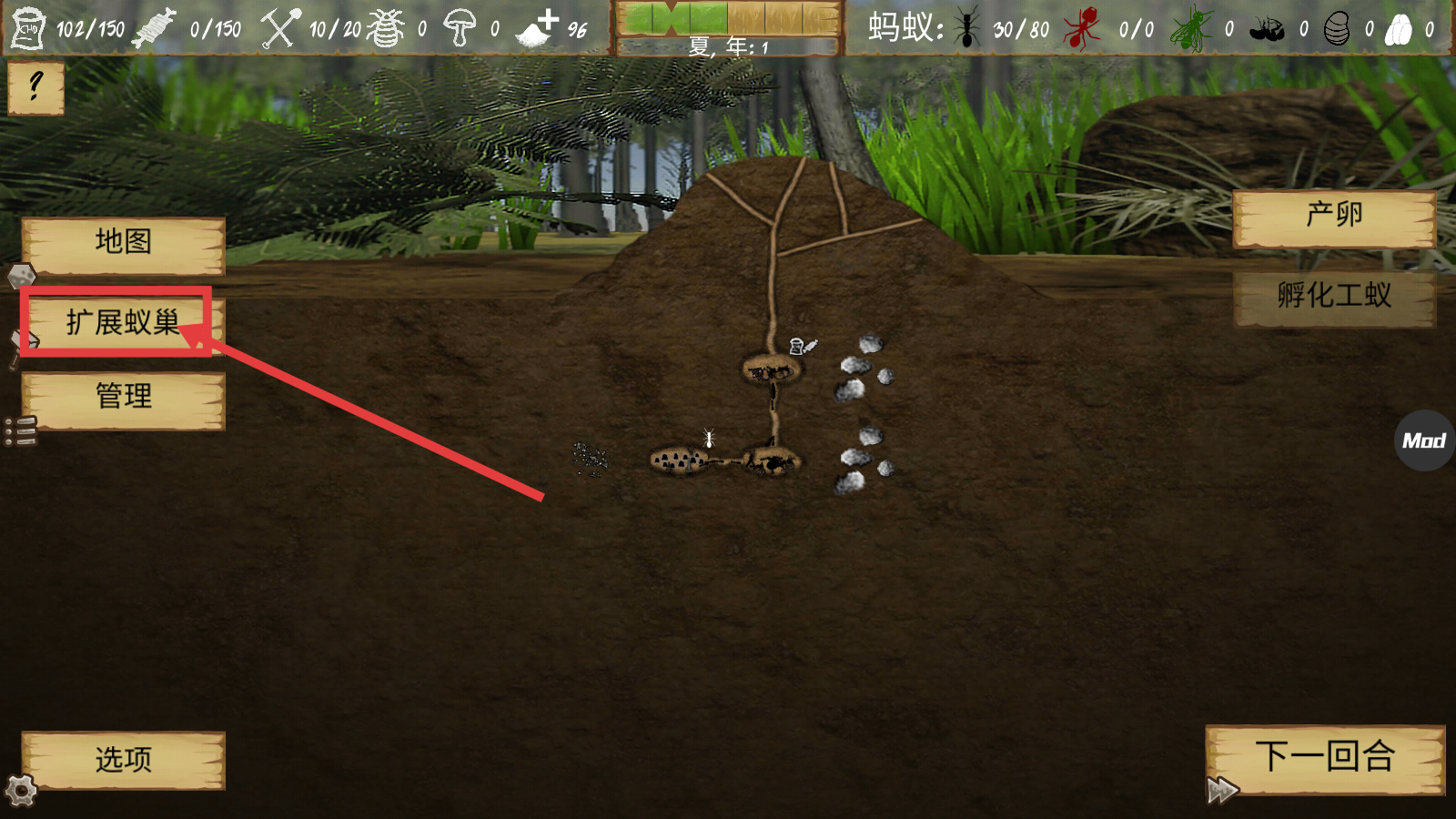 1、点击【扩展蚁巢】,进入建筑界面,规划蚁巢结构,为后续建筑与蚁群发展奠定基础。