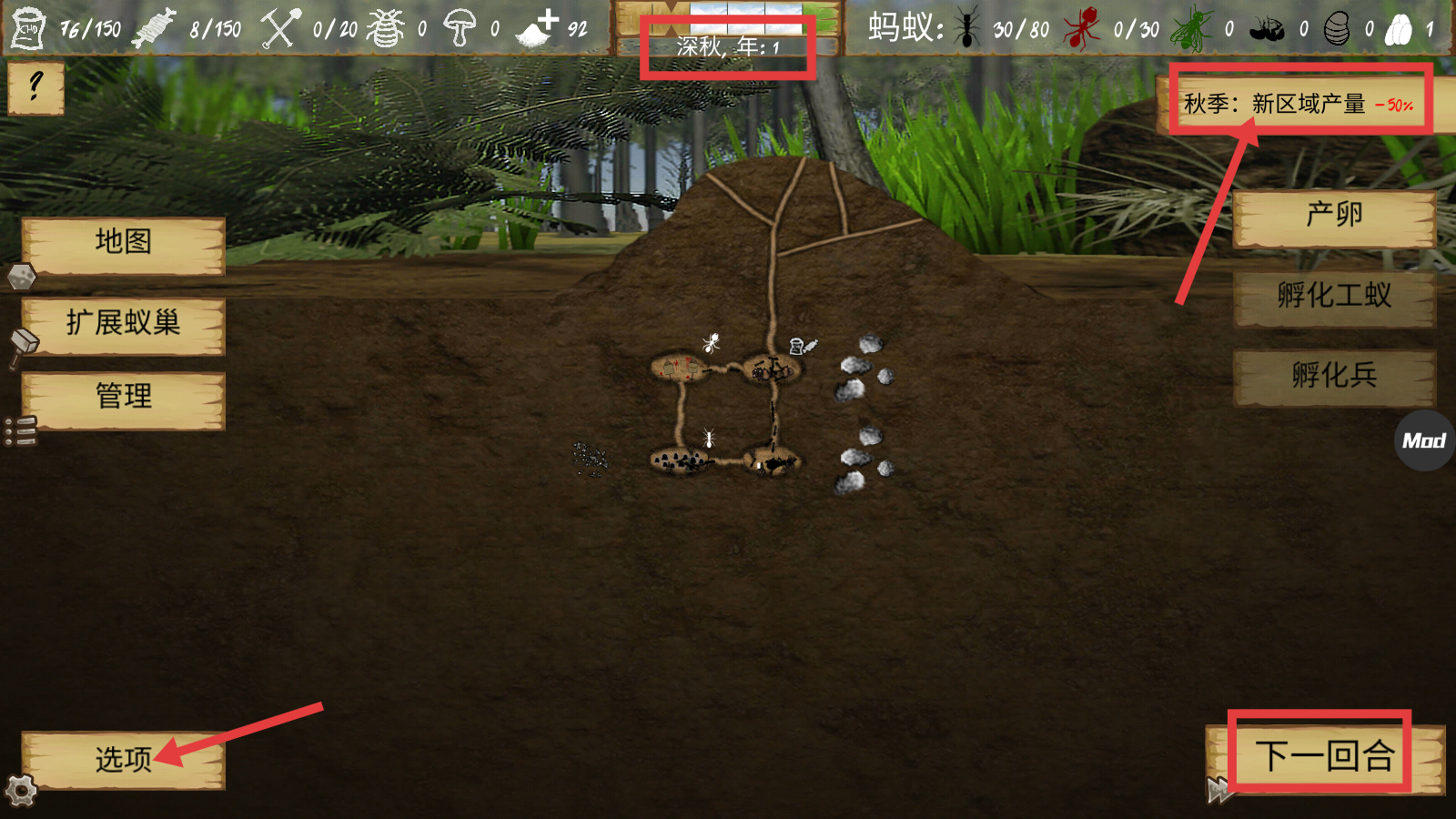 3、关注【深秋-年:1】的季节变化,留意【秋季-新区域产量-50%】的影响,点击【下一回合】推进游戏进程。