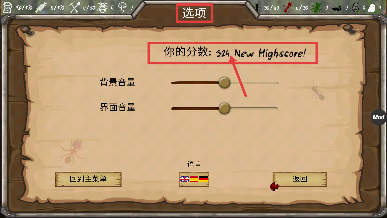 4、在【选项】界面,查看【你的分数:324-New-Highscore!】,记录成绩后可调整音量或语言,继续冲击更高分数。