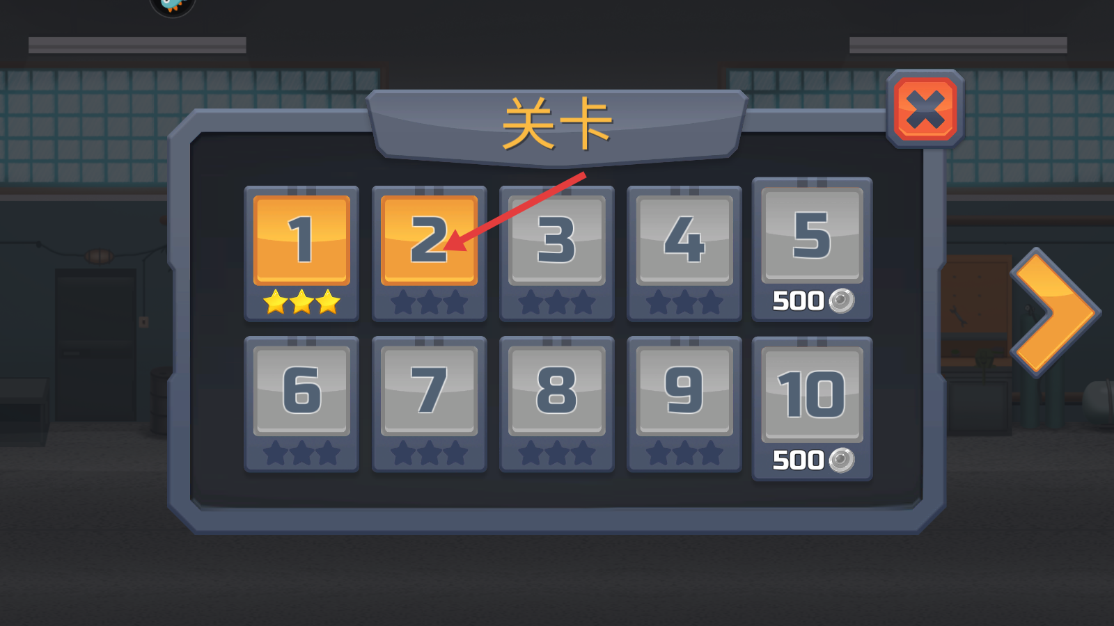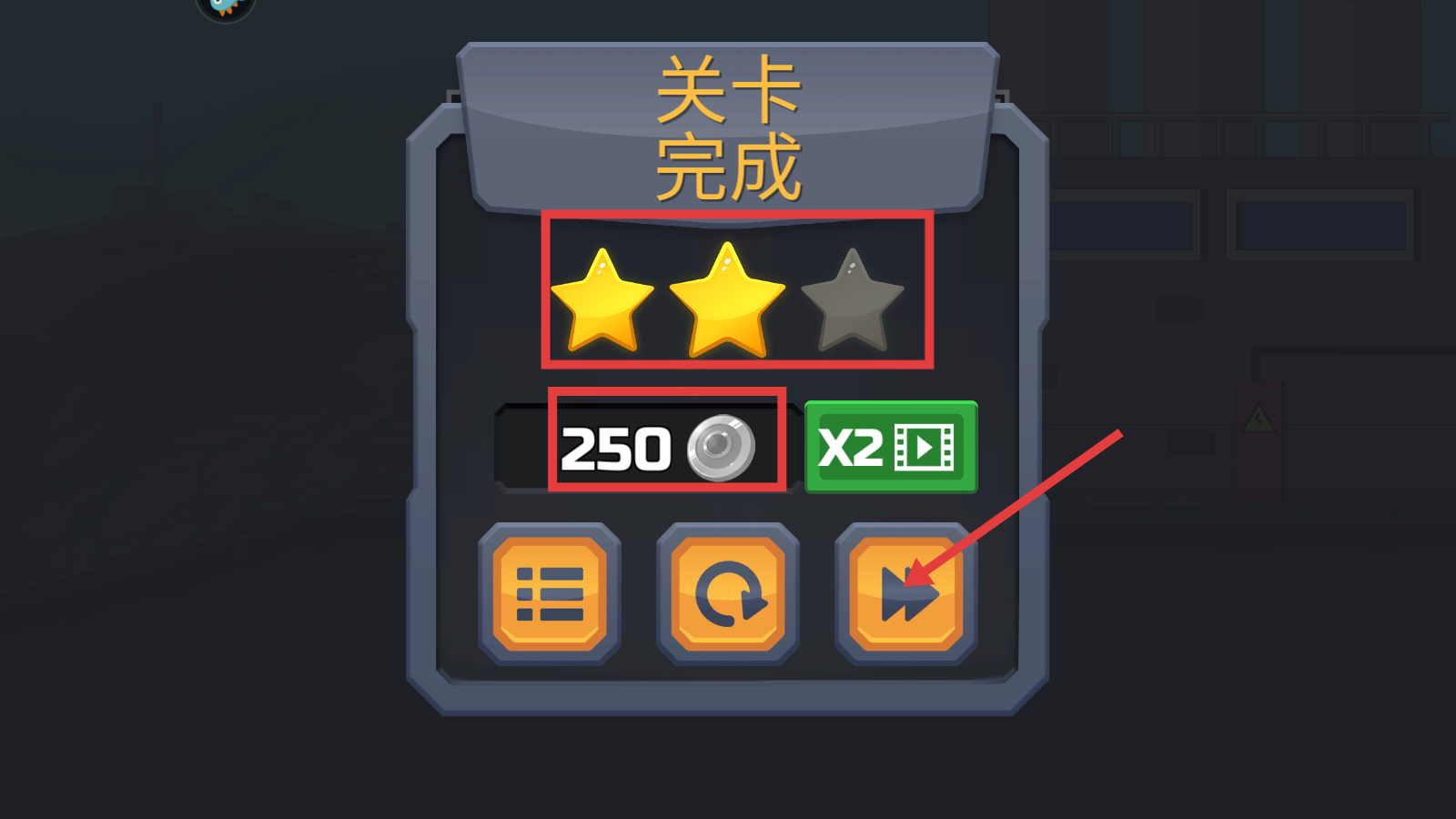 4、关卡完成后获得星级评价和【250】银币,点击箭头按钮继续下一关,积累资源解锁更多关卡。
