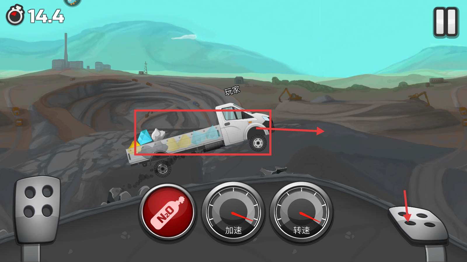 2、行驶时合理使用【N2O】加速,同时关注【加速】【转速】表,在复杂地形中保持卡车动力。