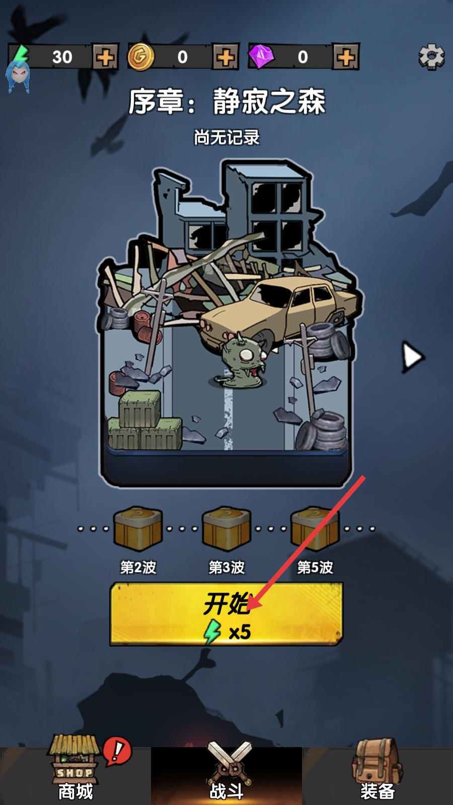 1、点击【开始-x5】进入序章【静寂之森】,消耗资源开启游戏,可逐步挑战后续波数。