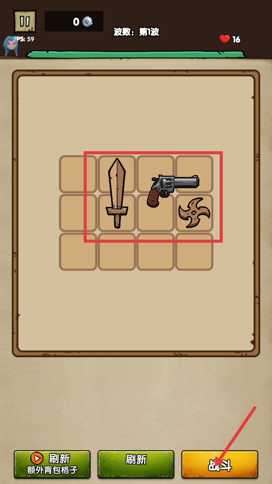 2、选择【剑】【手枪】【手里剑】武器,点击【战斗】进入第一波战斗,为战斗做好装备准备。