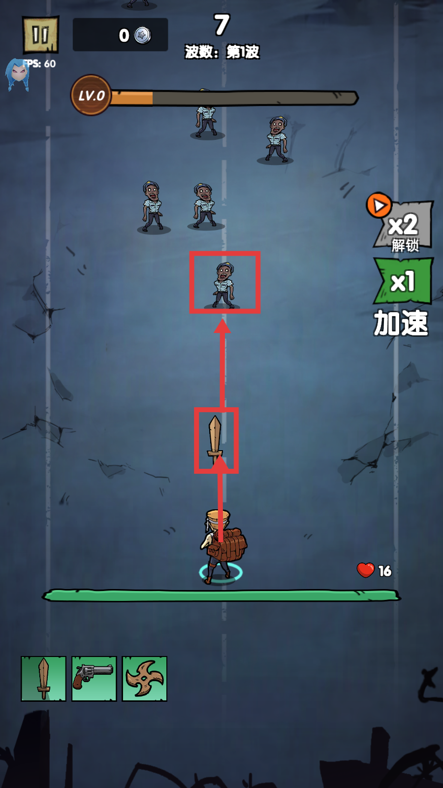 3、战斗中使用【剑】攻击敌人,关注【波数-第1波】和等级进度,逐步消灭敌人推进。