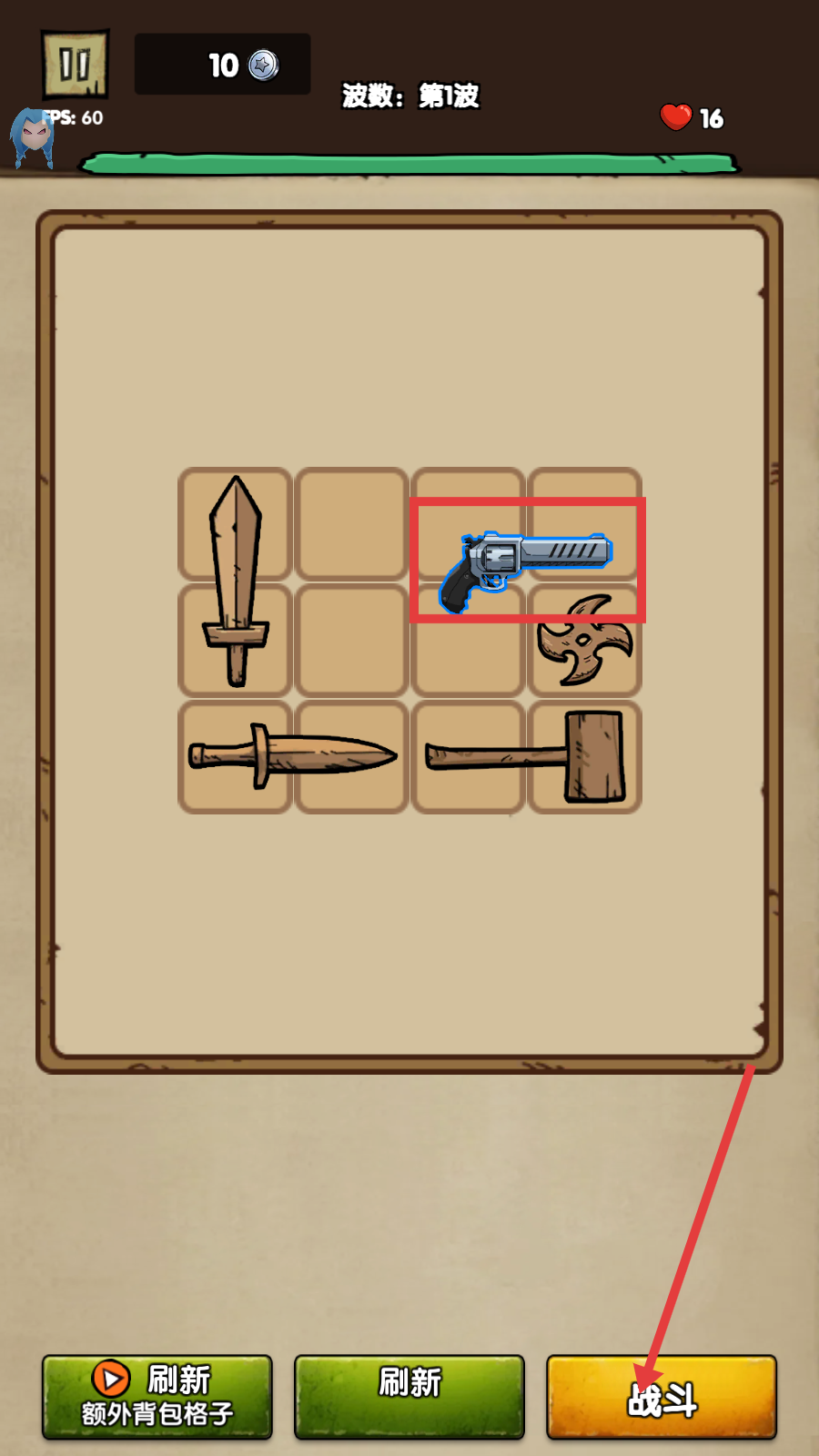 1、观察武器栏,将相同的【左轮手枪】合成升级,提升武器战力,为战斗打好基础。