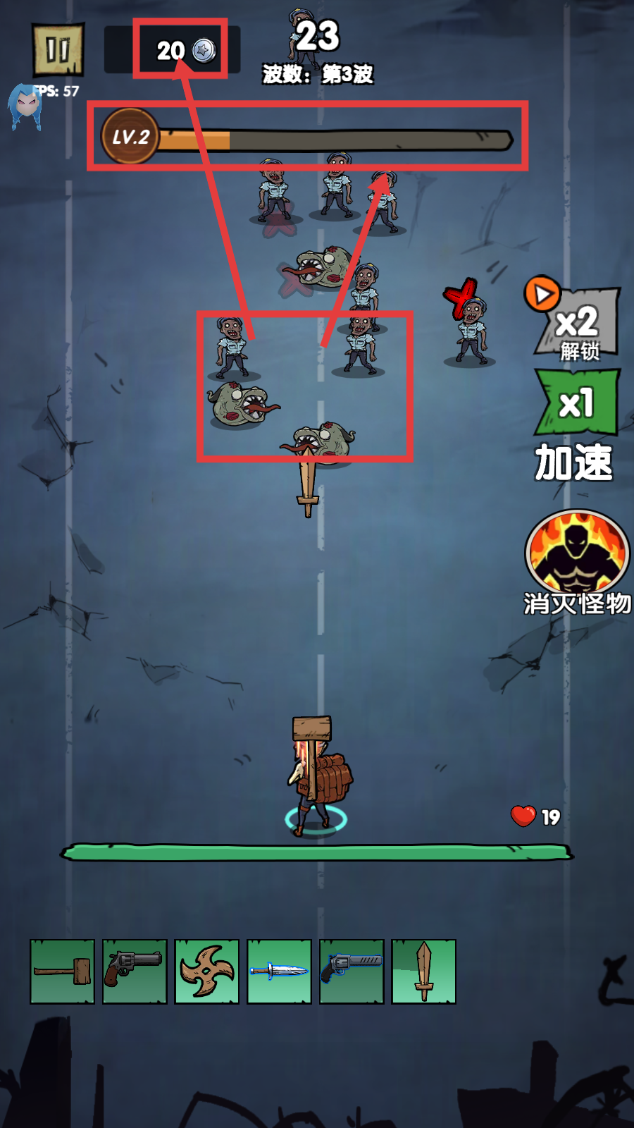 1、武器栏中有多种武器,点击【战斗】按钮,进入第2波战斗,继续推进关卡。