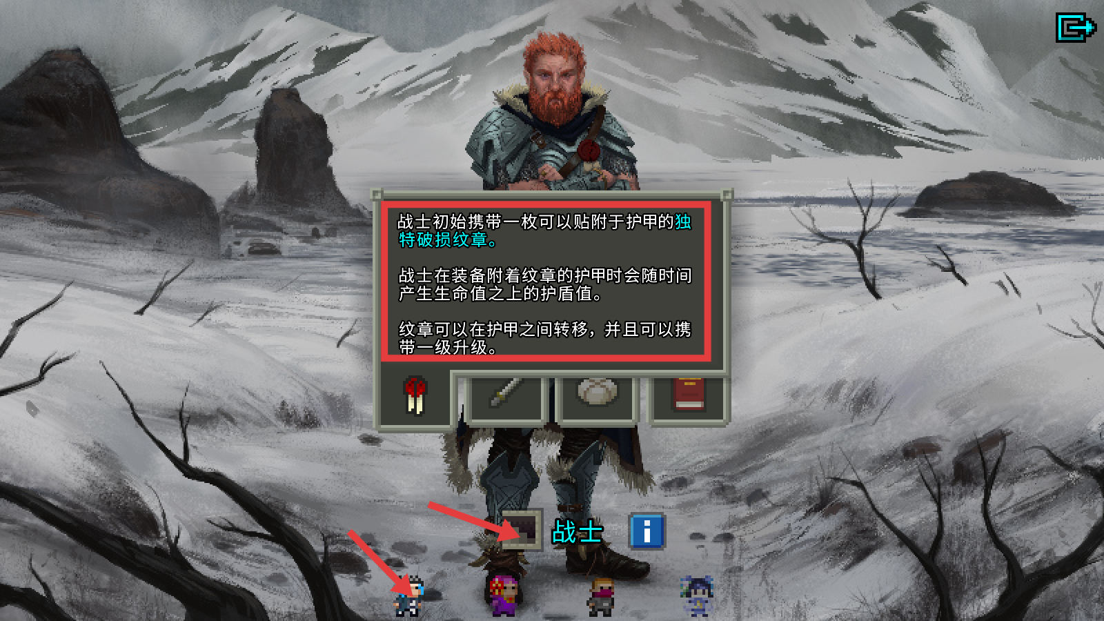 1、选择【战士】,初始携带【破损纹章】,装备护甲时产护盾,纹章可转移并带一级升级,利用此特性提升生存力。