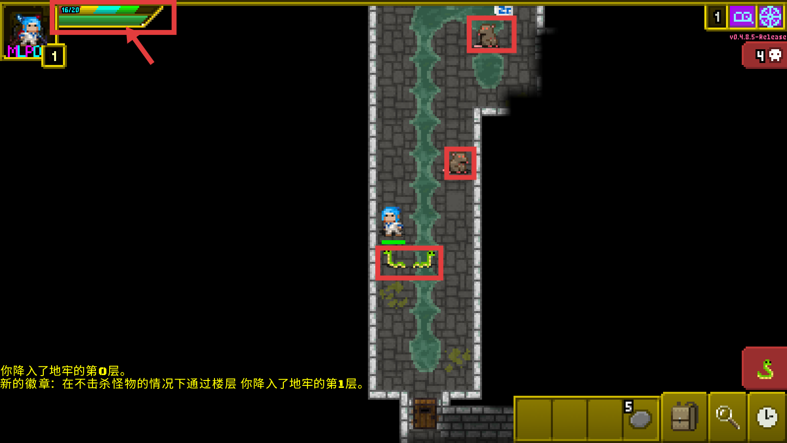2、地牢第0层,留意【16/20-生命值】,躲避老鼠和蛇类怪物,谨慎探索避免受伤。