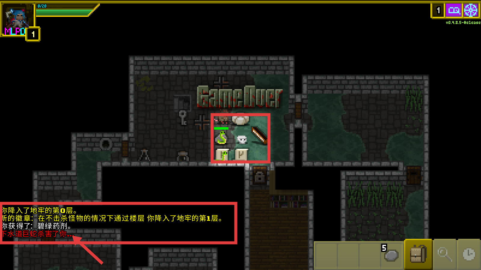 4、遭遇【下水道巨蛇】时需谨慎,其伤害高易致GameOver,探索时优先避开强力怪物,保障生存。