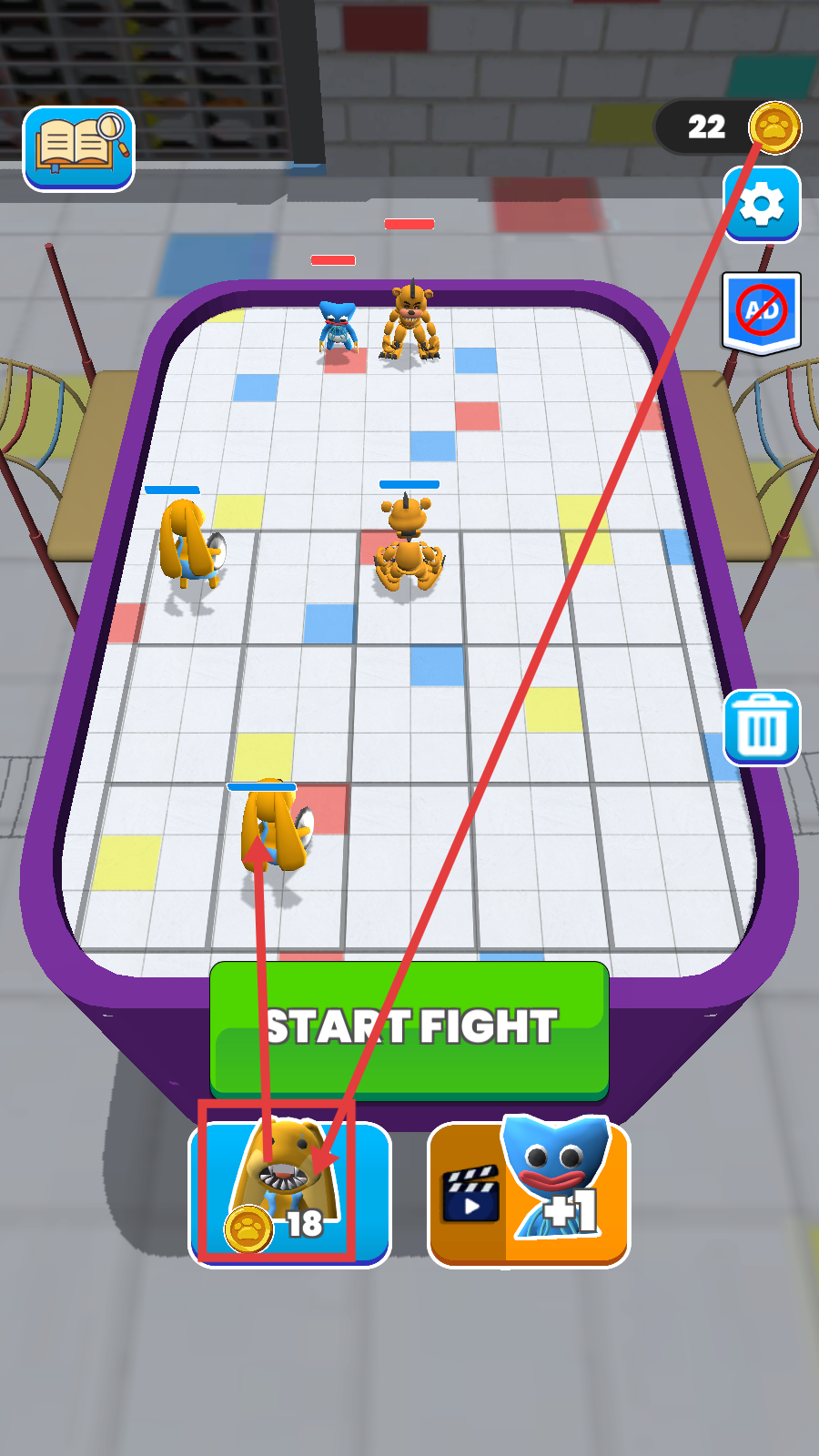 1、点击【START-FIGHT】,利用角色阵容,积累【18-金币】,金币达22,开启战斗进程。