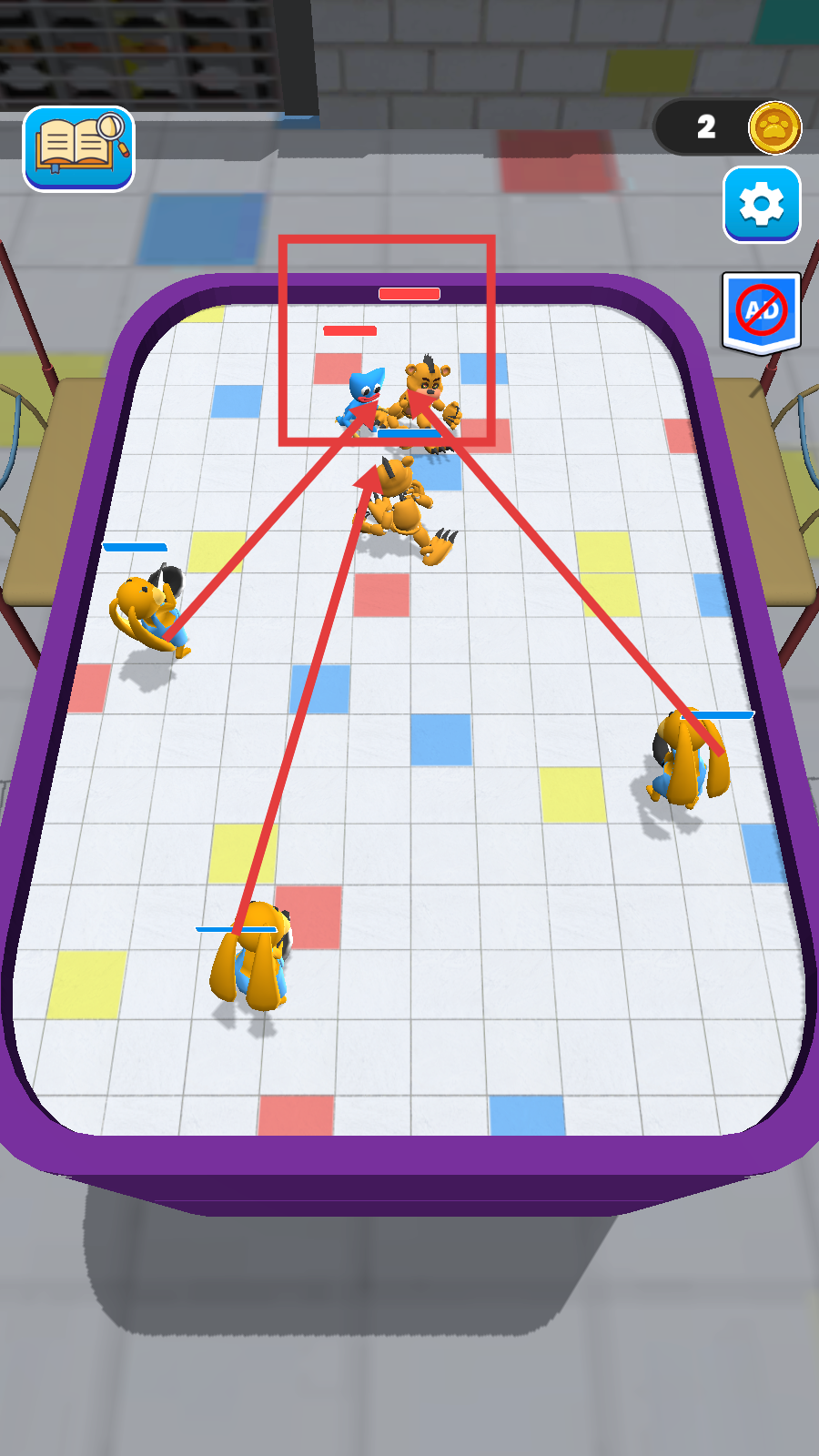 2、战斗中集火敌方蓝色与金色角色,协同攻击,削减其血量,推进关卡。