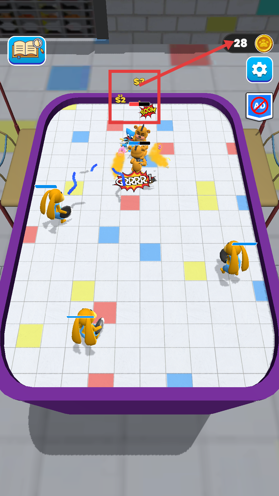 3、战斗中获取【$2】【$3】资源,金币达28,持续积累财富。