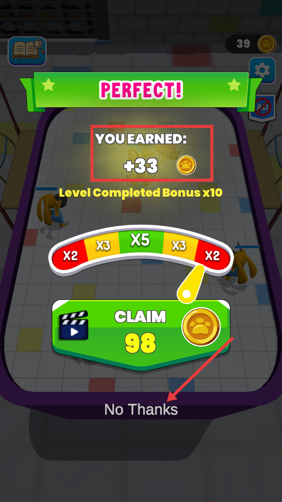 4、关卡完成获得【+33-金币】,点击【No-Thanks】,结束关卡,积累资源开启下一关。