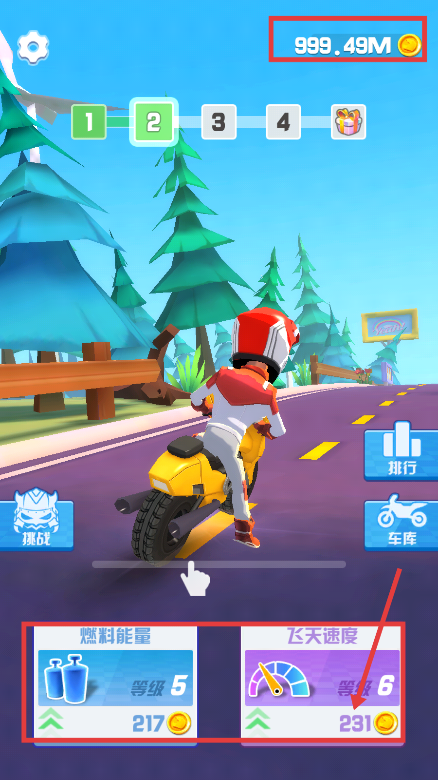 1、攒金币升级【燃料能量-等级5】和【飞天速度-等级6】,提升摩托车性能,为解锁新车和通关助力。