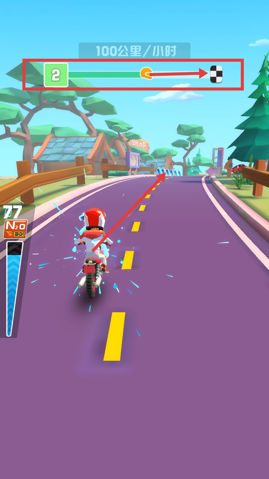 3、在【关卡2】中收集蓝色燃料瓶,保持速度朝着黑白格旗终点前进,推进关卡进度。
