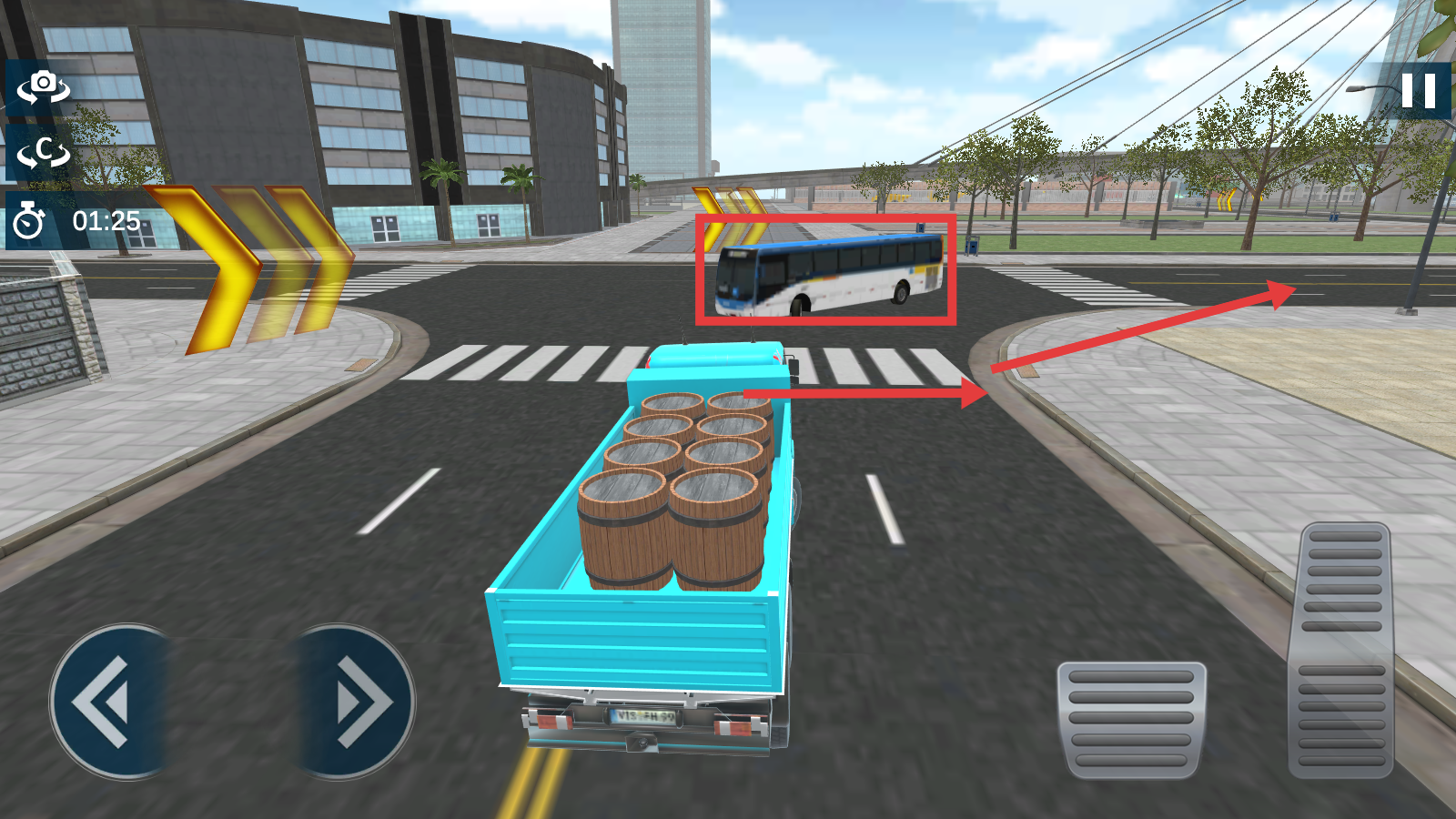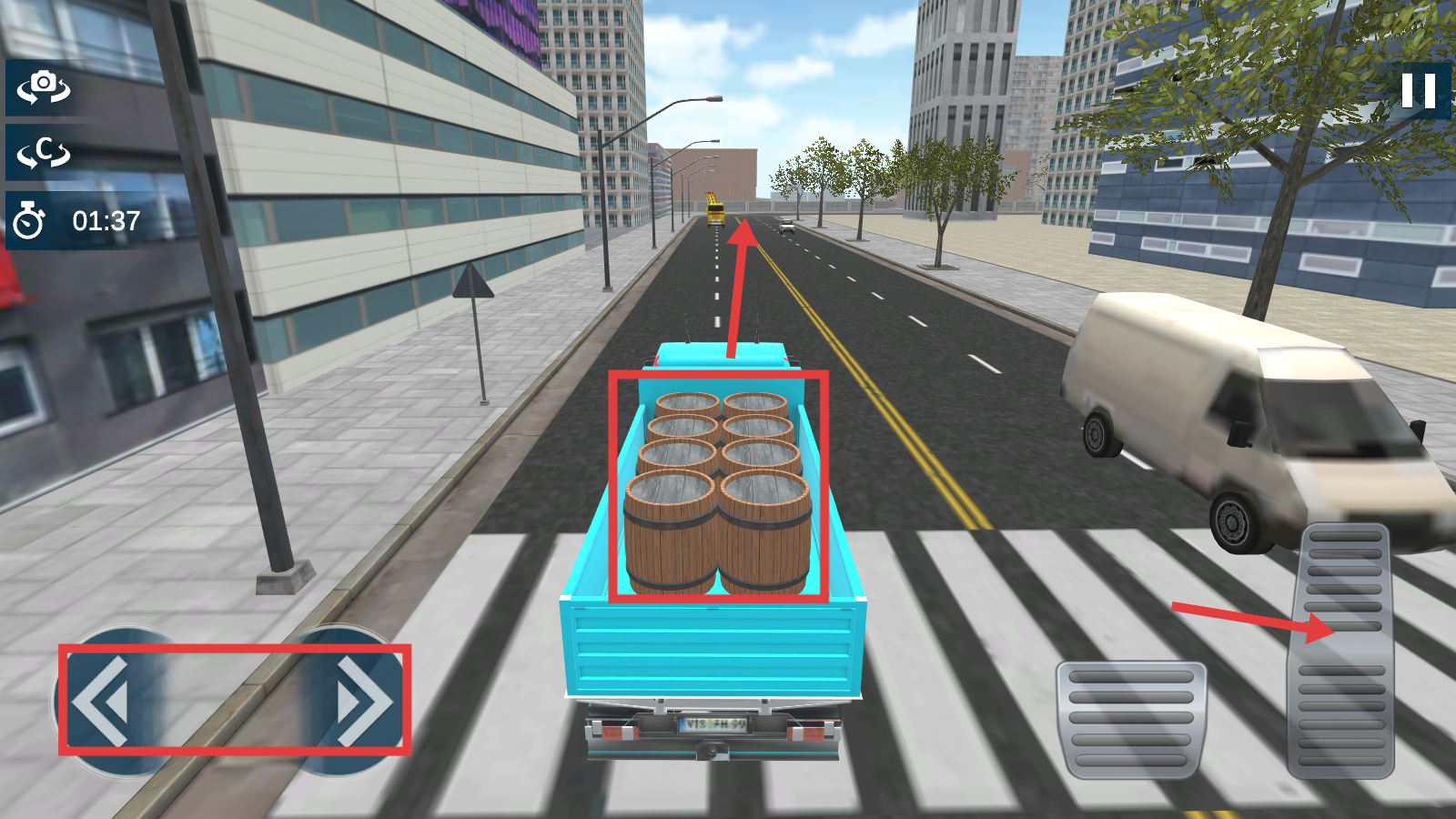 2、驾驶时利用左侧方向键和右侧油门控制卡车,装载桶并跟随箭头方向,推进运输进程。