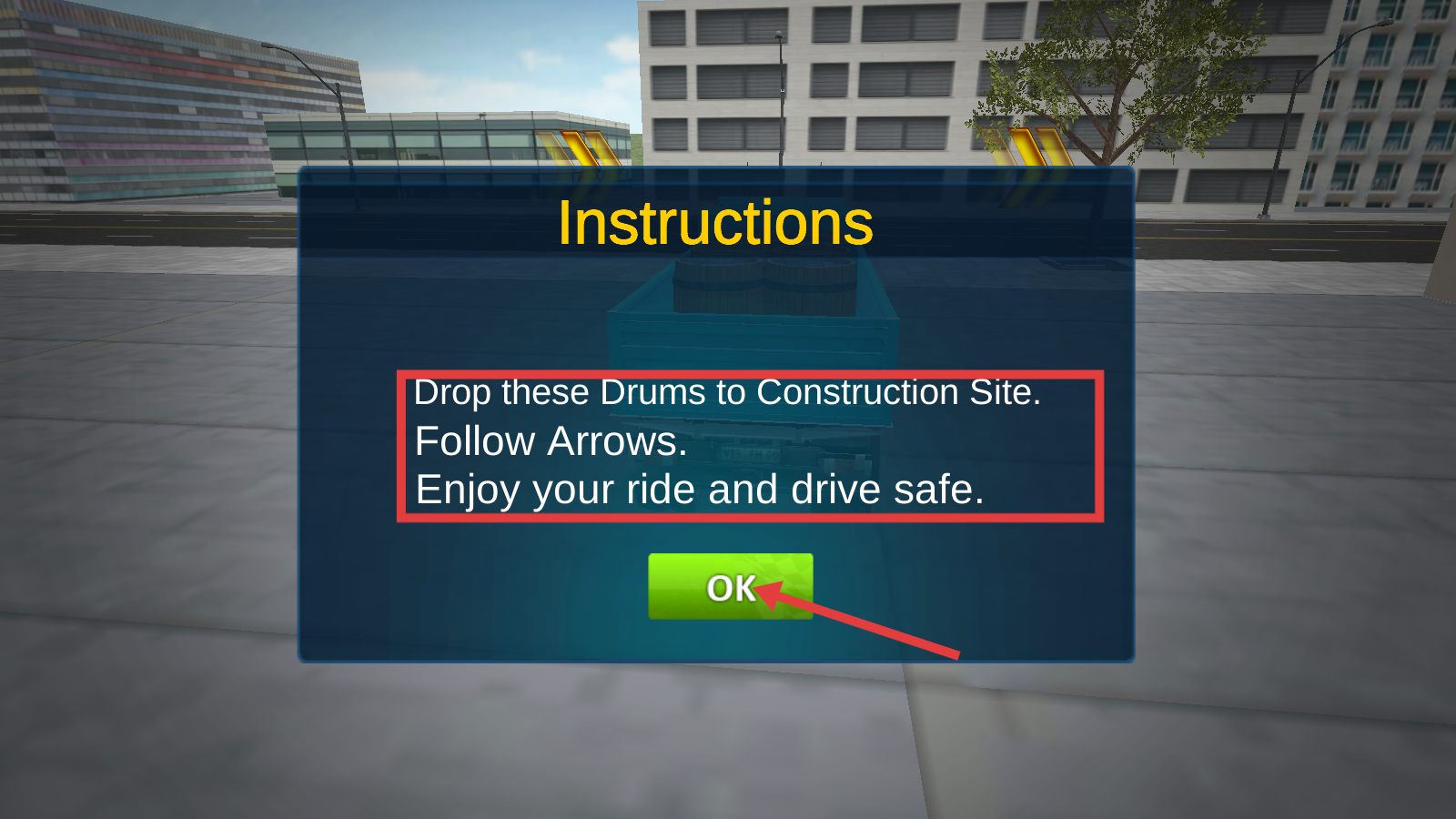1、点击【OK】,明确任务是将桶运到建筑工地,跟随箭头并安全驾驶,开启运输挑战。